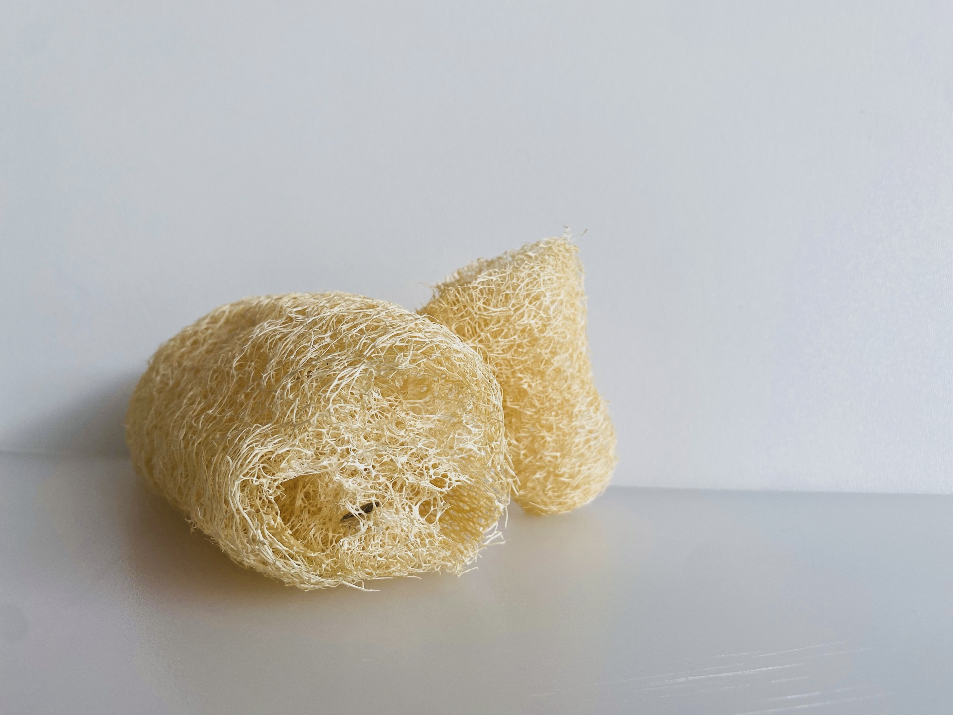 • Duas esponjas naturais de luffa bege claro em superfície branca.