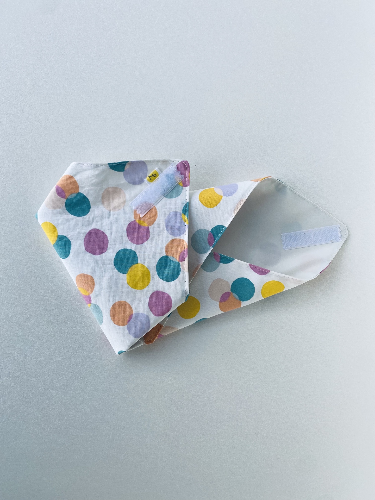 • Bandana triangular branca com bolinhas coloridas e fecho de velcro