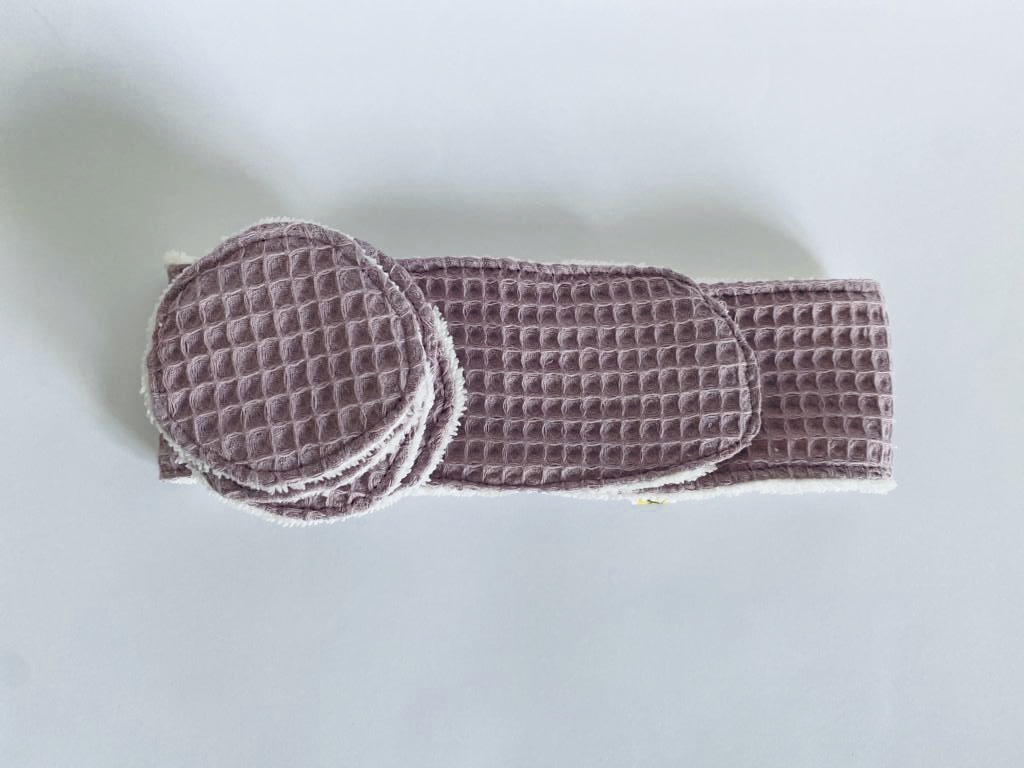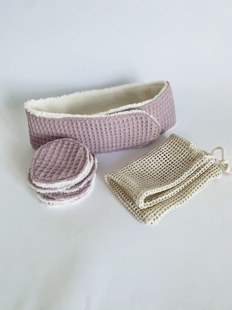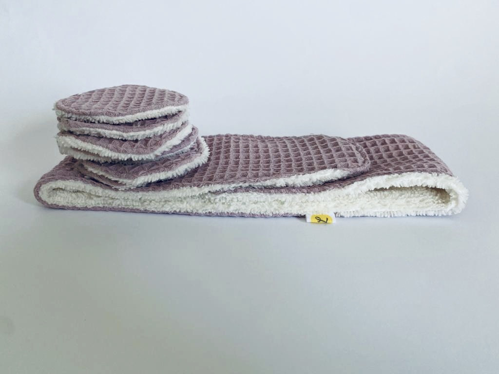 • Conjunto toalha e discos de algodão com textura tipo favo de mel roxo e cru sobre superfície branca