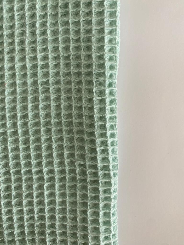 • Tecido de malha verde clara com padrão retangular ao lado direito